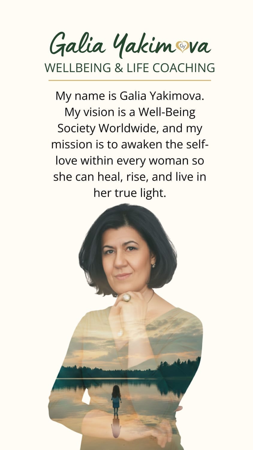 My name is Galia Yakimova. My vision is a Well-Being Society Worldwide, and my mission is to awaken the self-love within every woman so she can heal, rise, and live in her true light.