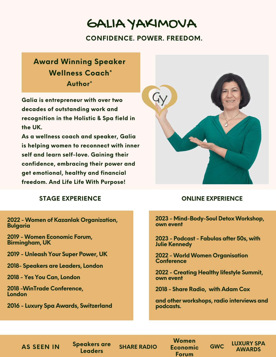 Galia is Bulgarian born, lived in the UK for 20 years. During these years I invested in the Well-being field. 15 years in the Holistic - Spa business and then I transit to Life Coaching, to serve women on a larger scale. Now, I help women to heal their inner wounds. Learn self-love and create healthy lives. To stand up, be heard, and live life with purpose!